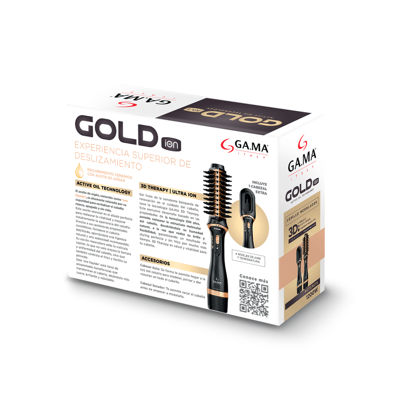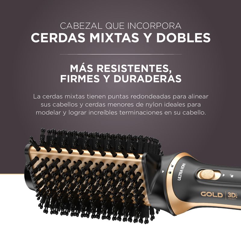 El Styler Gold incluye dos cabezales intercambiables para secar y modelar tu cabello en un solo paso. Su recubrimiento con aceite de Argán protege y nutre cada hebra, aportando hidratación y un brillo natural.La tecnología 3D Therapy Ultra ION libera 80% más iones negativos que restauran la estructura del cabello, reducen el frizz y potencian el brillo y la flexibilidad desde la raíz hasta las puntas.