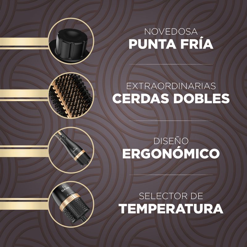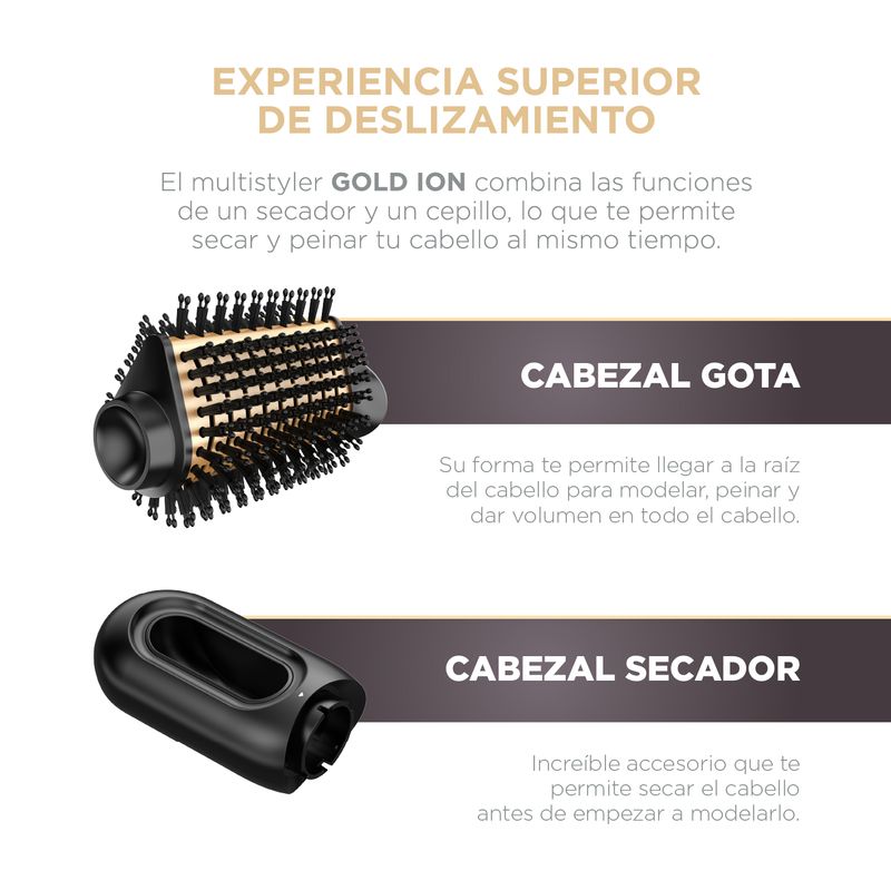Gracias a su diseño ergonómico y cerdas mixtas y dobles, el Styler Gold se desliza con suavidad desde la raíz hasta las puntas, brindando un modelado preciso sin tirones.Usá el cabezal secador para retirar la humedad del cabello y luego el cabezal en gota para alisar, dar volumen o modelar fácilmente, logrando resultados profesionales desde casa.Su cable rotativo 360° y selector de temperatura permiten un manejo cómodo, mientras que la punta fría asegura un peinado seguro y controlado.