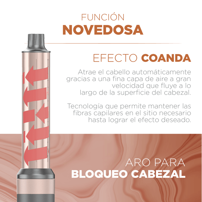 Gracias al Efecto Coanda, el cabello es atraído automáticamente por una fina capa de aire a alta velocidad, facilitando el modelado sin esfuerzo y reduciendo la exposición al calor extremo.