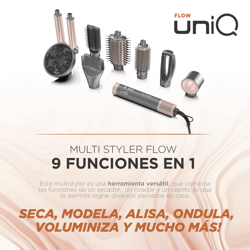 El Multi Styler UniQ Flow 9 en 1 de GA.MA Professional es la solución más completa para transformar tu cabello con resultados de salón en casa. Diseñado para máxima versatilidad, combina múltiples funciones en un solo dispositivo, permitiéndote secar, alisar, ondular, definir y dar movimiento con facilidad.