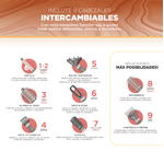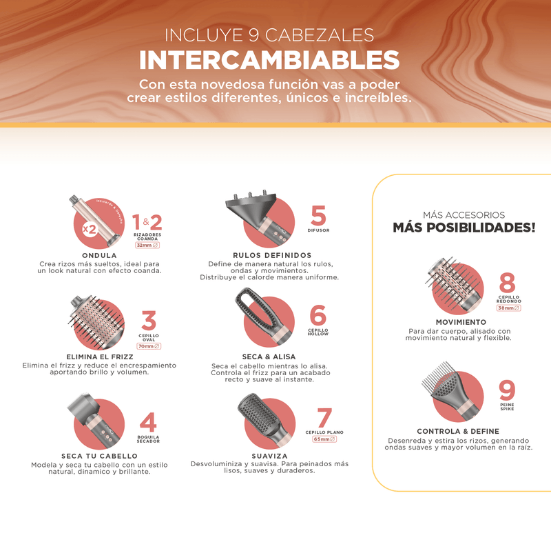 Incluye 9 cabezales intercambiables para lograr todo tipo de estilos: