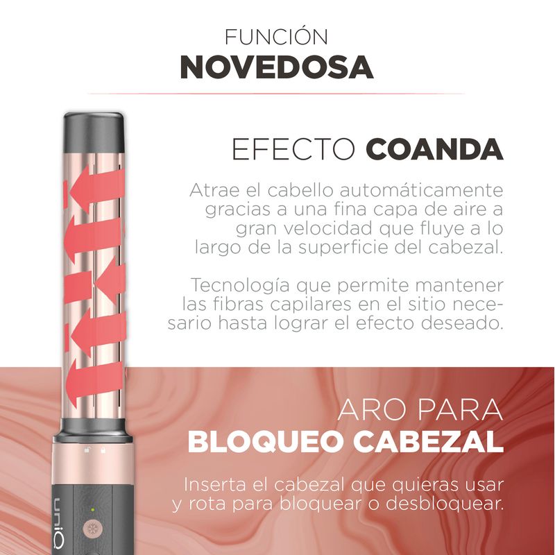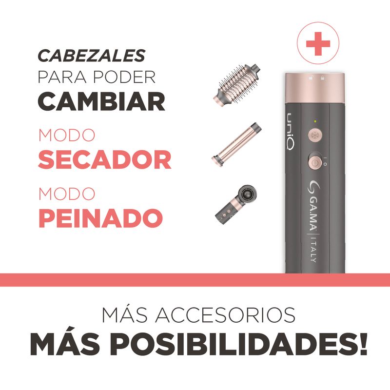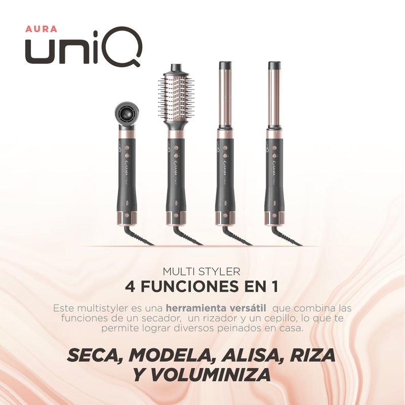 Equipado con cuatro cabezales intercambiables, el UniQ Aura ofrece todo lo que necesitas para un look perfecto: boquilla de secado rápido, cepillo alisador, moldeador con efecto Coanda y cepillo redondo para volumen. Su sistema de acople magnético facilita el cambio de accesorios, mientras el diseño ergonómico y liviano asegura un manejo cómodo incluso durante sesiones prolongadas.