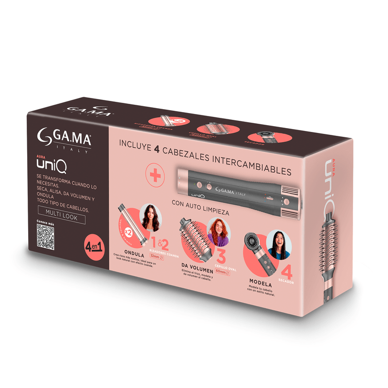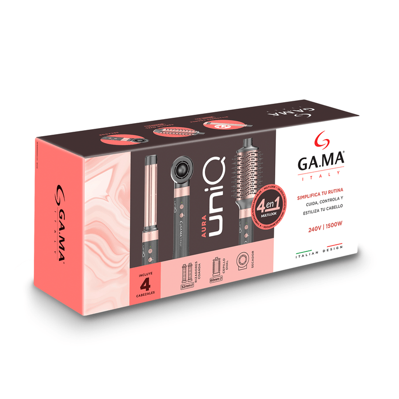 El Multi Styler UniQ Aura 4 en 1 de GA.MA Professional redefine el concepto de styling en casa, combinando potencia, tecnología avanzada y diseño italiano en una herramienta versátil, elegante y de alto rendimiento. Diseñado para quienes buscan resultados de salón con la comodidad del uso doméstico, este innovador dispositivo integra la exclusiva tecnología Coanda, que utiliza la fuerza del aire para atraer y moldear el cabello automáticamente, permitiendo crear rizos definidos, ondas suaves o un liso con volumen natural sin esfuerzo y sin daño por calor excesivo.