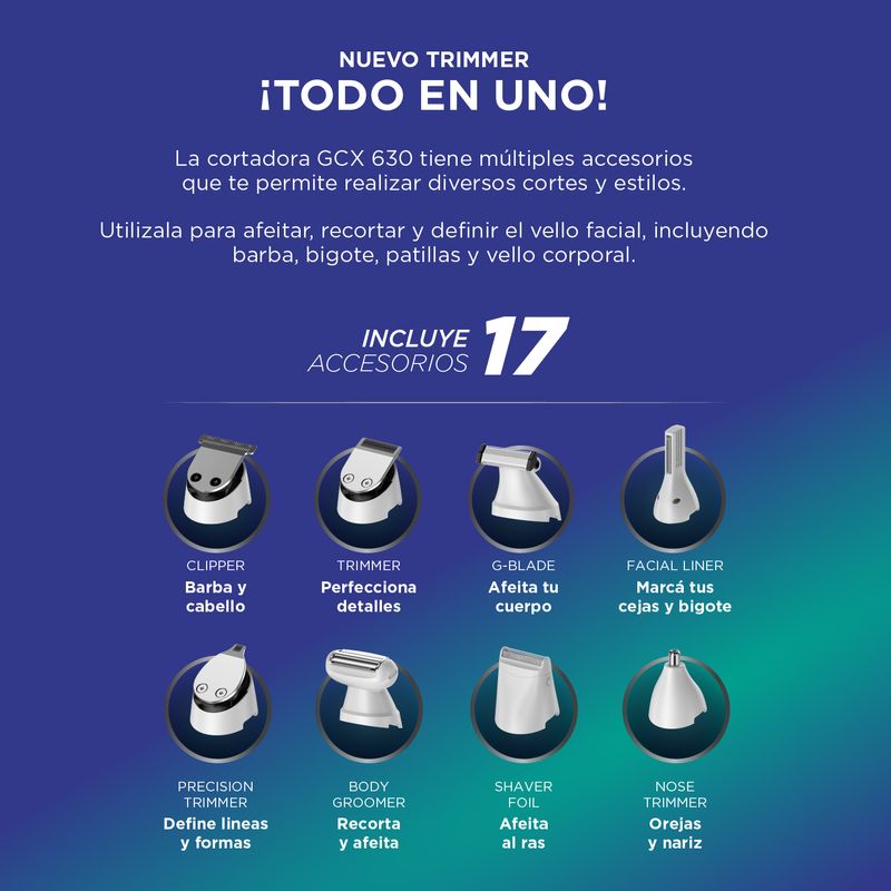 Con la GCX 630 puedes lograr desde un look prolijo hasta estilos más definidos, sin necesidad de múltiples herramientas. Todo lo que necesitas, en un solo dispositivo.