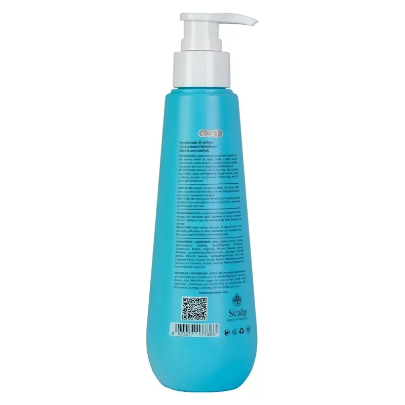 Acondicionador que hidrata y suaviza el cabello mientras calma y refresca el cuero cabelludo. Su fórmula ligera fortalece y aporta brillo, dejando el pelo más manejable y saludable. Ingredientes principales: Aceite de Argán: nutre y protege la fibra capilar, aportando brillo y suavidad. Aceite de Jojoba: equilibra la hidratación del cuero cabelludo y acondiciona el cabello. Aceite de Menta: refresca, estimula la circulación y proporciona sensación de frescura.