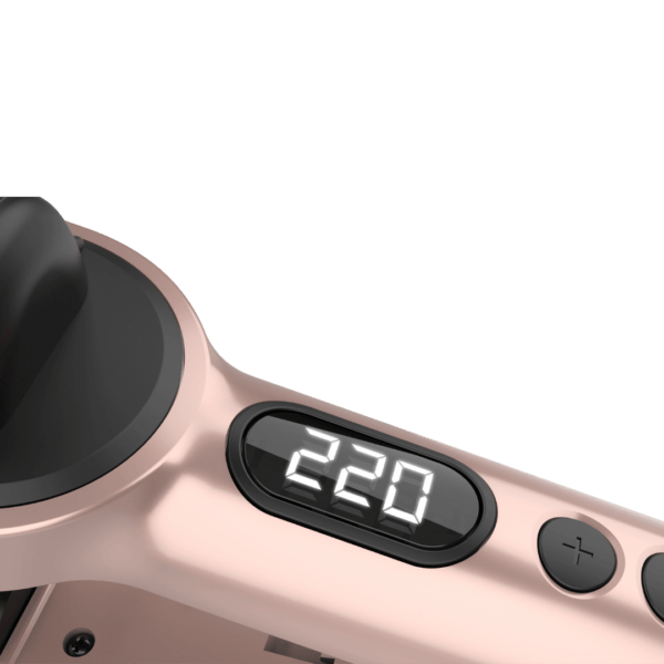 La temperatura es ajustable de 140° a 220° gracias a la pantalla digital, y la tecnología Quick Heat asegura un calentamiento rápido para un peinado eficiente.