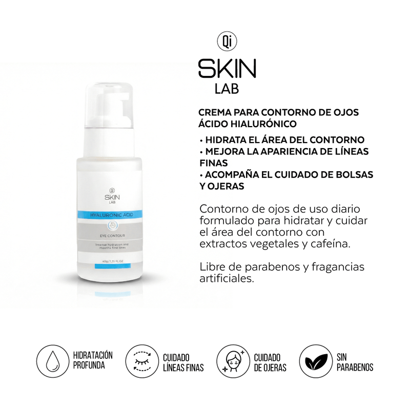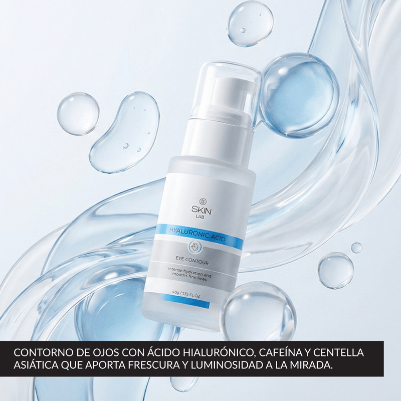 Crema para el contorno de ojos con ácido hialurónico que ayuda a mantener la piel hidratada y a mejorar la apariencia de líneas finas, bolsas y ojeras. Su fórmula incluye extractos vegetales y cafeína.