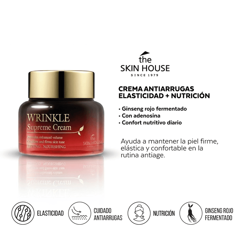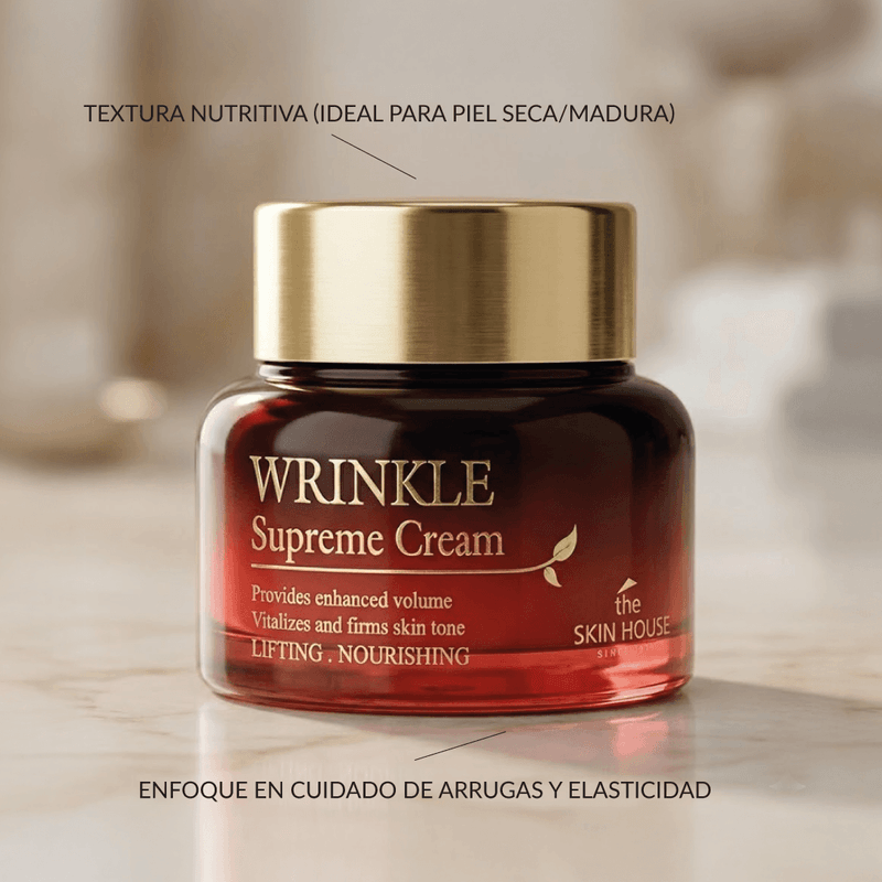 The Skin House Crema Wrinkle Supreme es un tratamiento intensivo diseñado para mejorar la firmeza y suavizar los signos visibles del envejecimiento. Su fórmula combina péptidos, colágeno y activos hidratantes de alto rendimiento que fortalecen la barrera cutánea, devuelven elasticidad y ayudan a disminuir la apariencia de arrugas profundas.