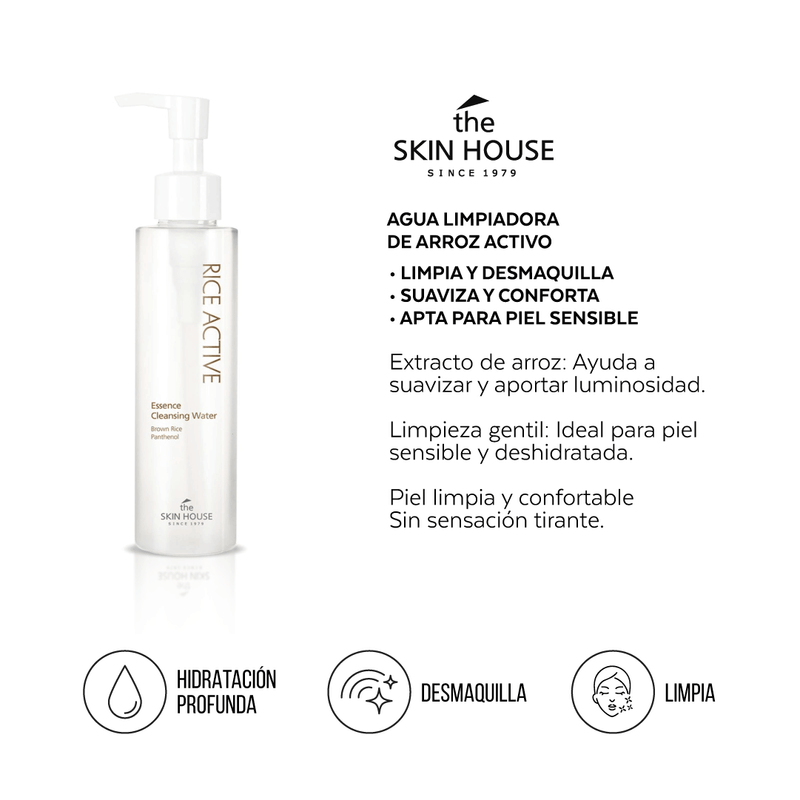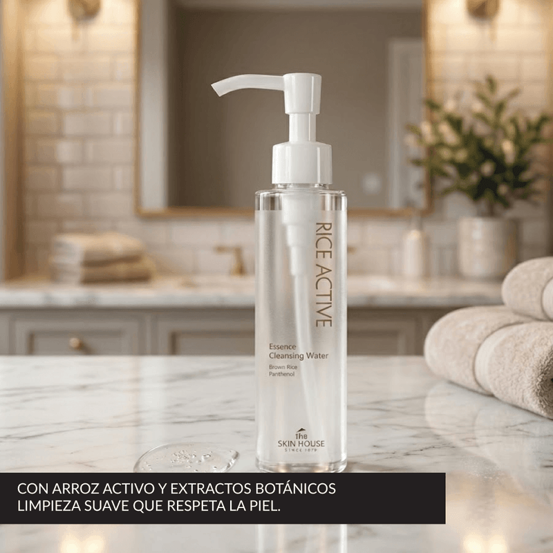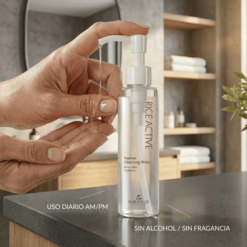 The Skin House Esencia Limpiadora Rice Active es un limpiador facial de textura ligera tipo esencia, formulado con extracto de arroz y activos suavizantes que ayudan a limpiar la piel sin resecarla. Su acción delicada elimina impurezas y residuos mientras aporta hidratación y mejora la luminosidad natural del rostro. Gracias a sus propiedades iluminadoras y equilibrantes, contribuye a unificar el tono y mejorar la textura desde el primer paso de la rutina. Ideal para pieles normales a secas, apagadas o sensibles que buscan una limpieza efectiva pero respetuosa con la piel.